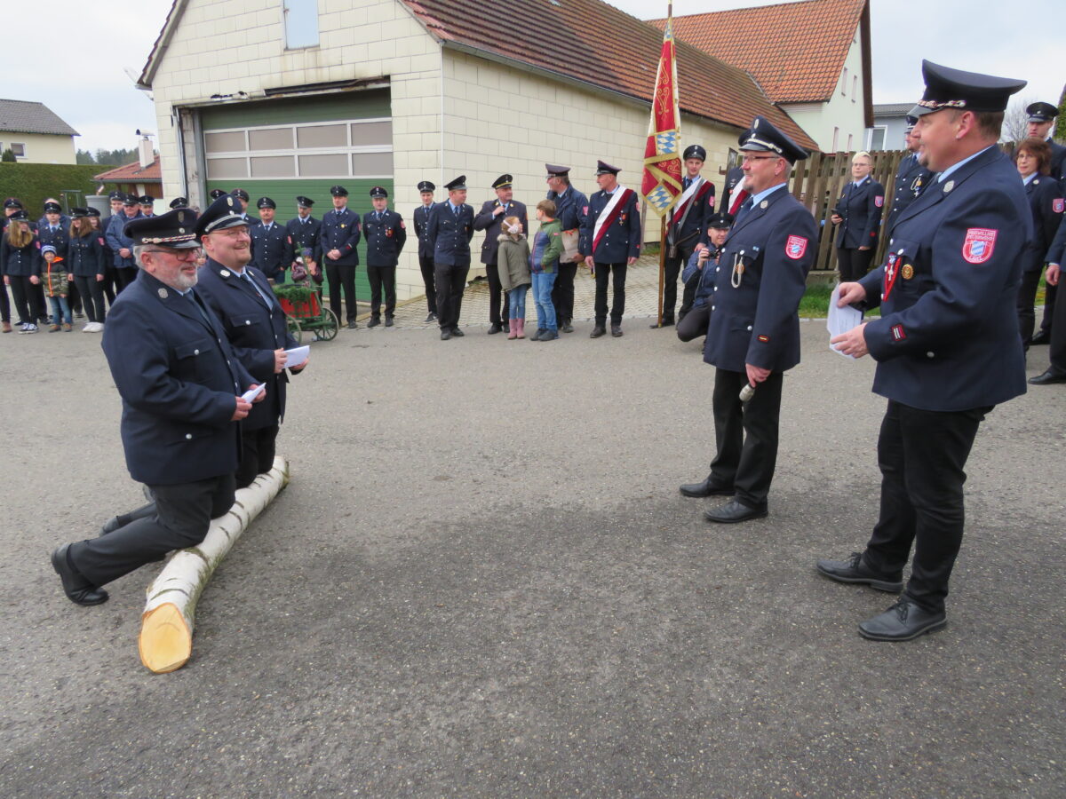 Püchersreuth. Auf einem Birkenstamm knieend baten der Kommandant Bastian Reiser und der Vorstand Rudolf Kreuzer der Freiwilligen Feuerwehr Ilsenbach auf dem Dorfplatz in Lanz um die Übernahme der Patenschaft für das 150-jährige...